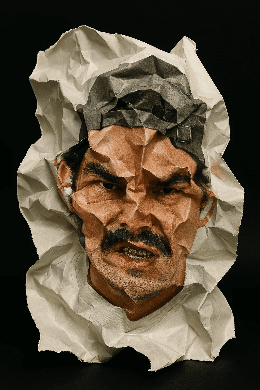 PROMT:chubby pale boyish head with red-cheeked realistic skin, eyes bulging in panicked scream, sealed in thick industrial vacuum film — plastic compresses double chin and forehead, beanie imprint visible through wrap. VETEMENTS sticker with graffiti font, SOUTH PARK barcode on puffy cheek, exaggerated grotesque realism I have attached references, use them as material, do not copy elements.